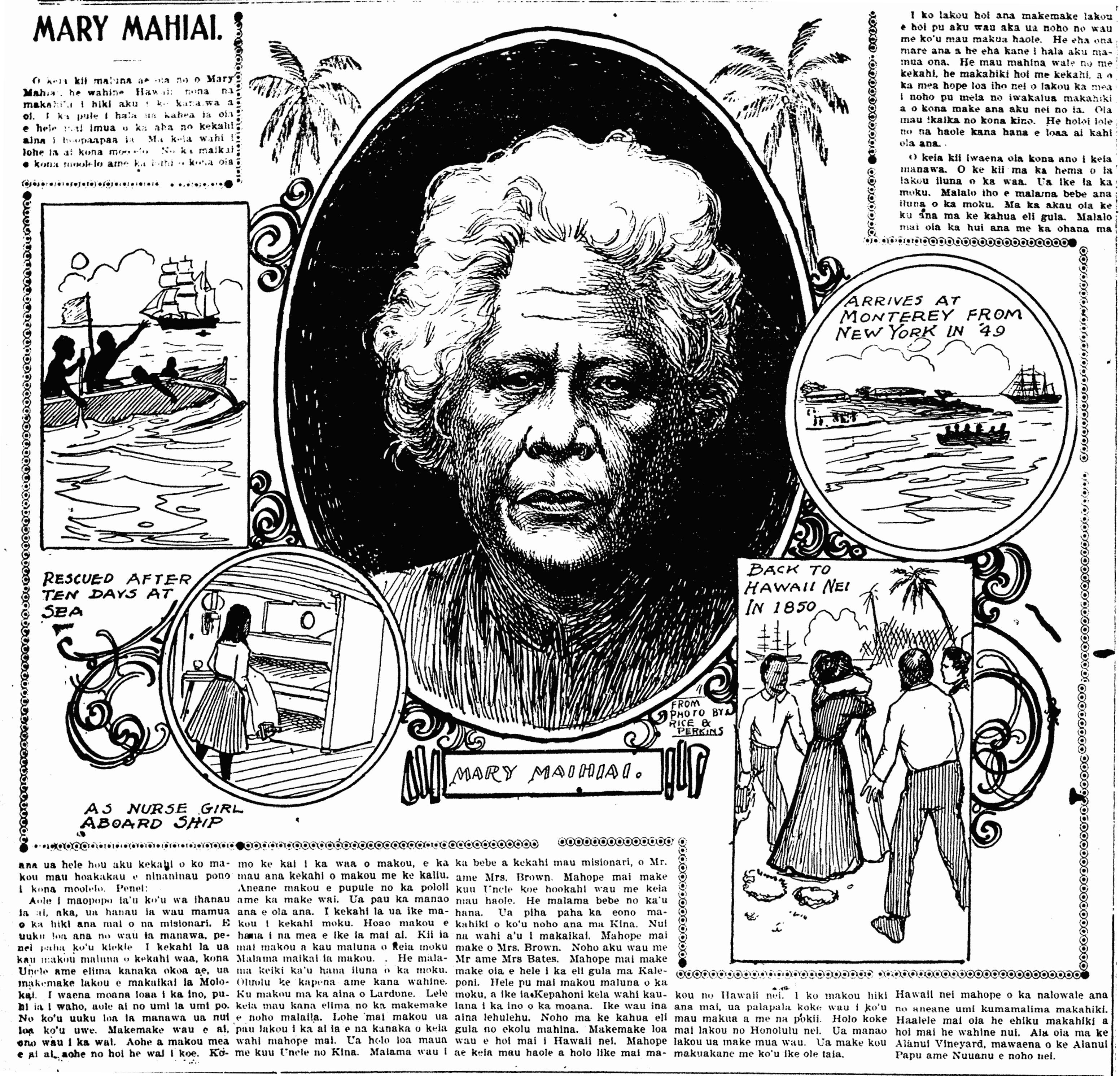 The picture above is of Mary Mahiai, a Hawaiian woman who is ninety years old or more. Last week, she was called to court over land that is being fought over. Here, her story was heard. Because of her good story and her long life, one of our writers went once again to ask her about her history. And this is it: