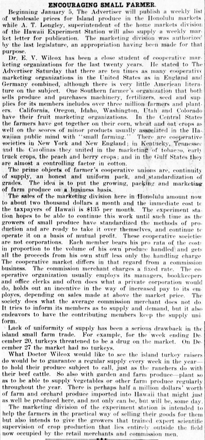 Dr. E. V. Wilcox has been a close student of cooperative marketing organizations for the last twenty years. He stated to The Advertiser Saturday that there are ten times as many cooperative marketing organizations in the United States as in England and Germany combined, although there is very little American literature on the subject. One Southern farmer’s organization that both sells produce and purchases machinery, fertilizers, seed and supplies for its members includes over three million farmers and planters. California, Oregon, Idaho, Washington, Utah and Colorado have their fruit marketing organizations. In the Central States the farmers have to together on their corn, wheat and oat crops as well on the scores of minor products usually associated in the Hawaiian public mind with “small farming.” There are cooperative societies in New York and New England; in Kentucky, Tennessee and the Carolinas they united in the marketing of tobacco, early truck crops, peach and berry crops; and in the Gulf States they are almost a controlling factor in cotton.