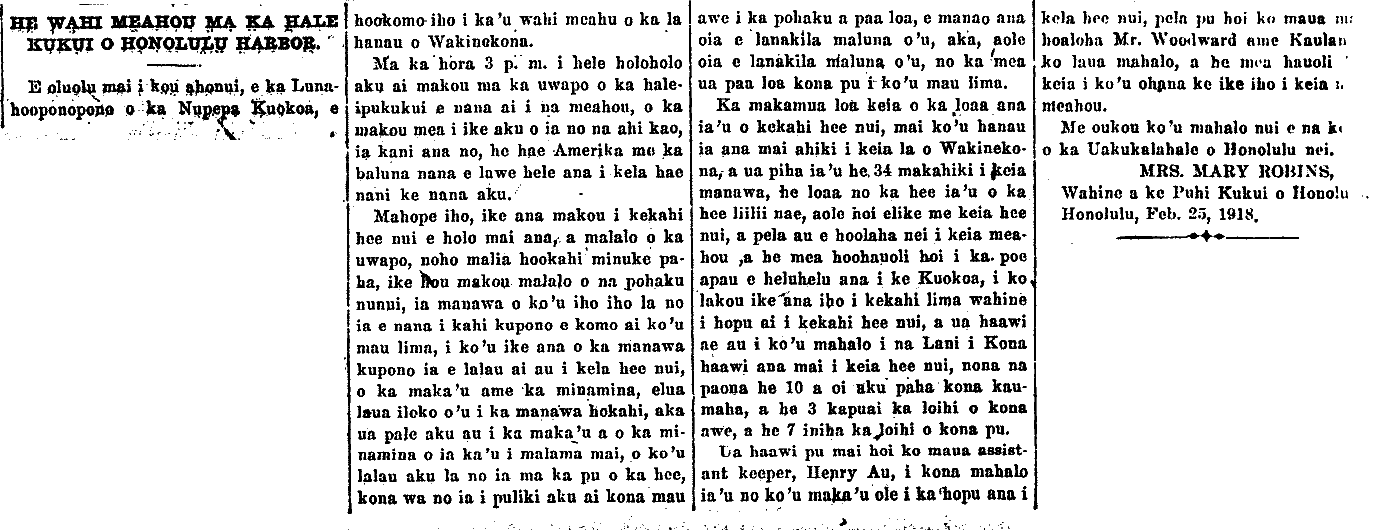 This is the very first time that I have caught a big hee, from my birth until this Washington Day,¹ and I am 34 years old now; I have caught hee, but they were small and not like this huge one, and thus I am making this news known, and it is something that should make all reading the Kuokoa happy, learning that the hands of a woman caught a huge hee; and I extend my appreciation to the Heavens for giving me this great hee that weighs 10 pounds and more perhaps, its tentacles are 3 feet long, and its head is 7 inches long.