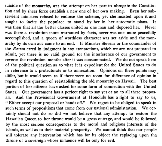 …suicide of the monarchy, was the attempt on her part to abrogate the Constitution and by sheer force establish a new one of her own making. Even her subservient ministers refused to endorse the scheme, yet she insisted upon it and sought to incite the populace to stand by her in her autocratic plans. It was then that all the better classes united as one man and deposed her. Never was there a revolution more warranted by facts, never was one more peacefully accomplished, and a queen of worthless character was set aside and the monarchy by its own act came to an end. If Minister Stevens or the commander of the Boston erred in judgment in any transaction, which we are not prepared to admit, yet there is no valid ground for the interference of our government to reverse the revolution months after it was consummated. We do not speak here of the political question as to what it is expedient for the United States to do in reference to a protectorate or to annexation. Opinions of these points may differ, but it would seem as if there were no room for difference of opinion in regard to this question of reestablishing the old monarchy on Hawaii. The best portion of her citizens have asked for some form of connection with the United States. Our government has a perfect right to say yes or no to all these proposals. And the Provisional Government at Honolulu has a right to say to us, “Either accept our proposal or hands off.” We regret to be obliged to speak in such terms of propositions that come from our national administration. We certainly should not do so did we not believe that any attempt to restore the Hawaiian Queen to her throne would be a gross outrage, and would be followed by the most serious consequences to the moral and religious interests of the islands, as well as to their material prosperity. We cannot think that our people will tolerate any intervention which has for its object the replacing upon the throne of a sovereign whose influence will be only for evil.