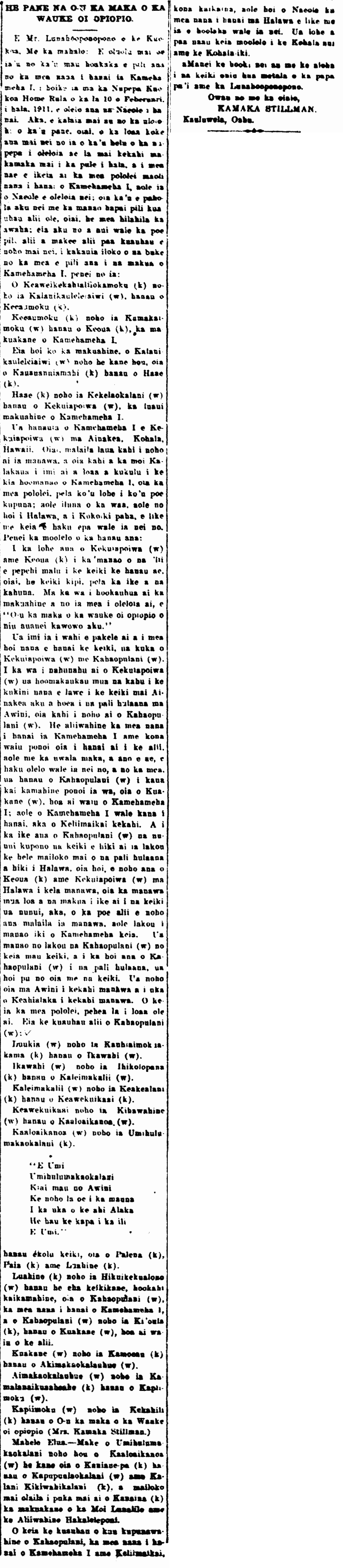 O Mr. Editor of the Kuokoa. With appreciation: Please allow my clarification pertaining to the person who raised Kamehameha I. which was shown in the newspaper Kuokoa Home Rula of the past 10th of February, 1911, which said that it was Naeole who raised him. Forgive me for my late response, but I just received the issue of the aforementioned newspaper from a friend last week, and so that the true person who raised Kamehameha I. is known, who is not Naeole, that is the reason I am disseminating this information without the intent to show my relation to royal genealogy, being that it is shameful to speak haughtily; there are many now living who are related to alii and who prize the alii genealogist who are written in the books about the relatives of the parents of Kamehameha I., and here they are: