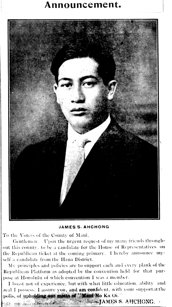 I boast not of experience, but with what little education, ability and zeal I possess, I assure you, and am confident, with your support at the polls, of upholding our motto of “Maui No Ka Oi.”