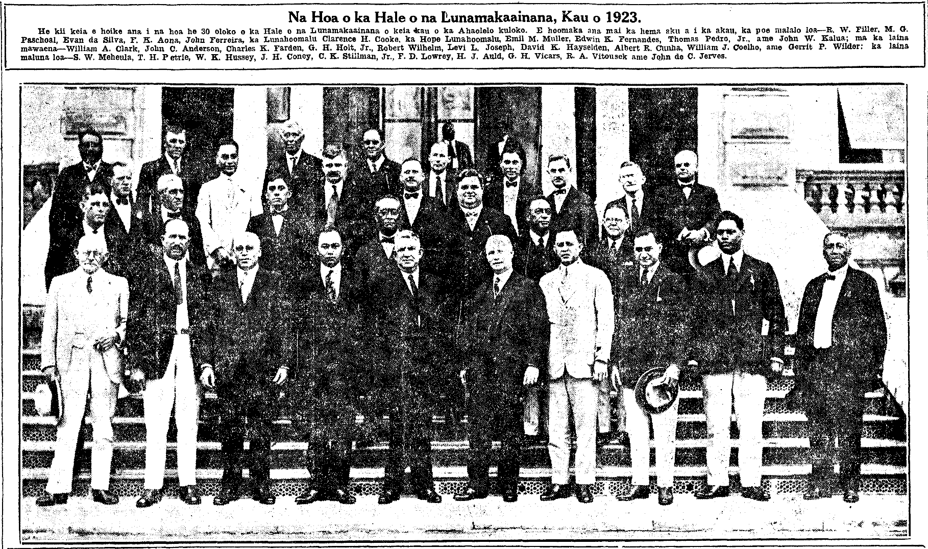 This is a picture of the 30 members of the House of Representatives of this session of the local Legislature. Beginning from the left to the right, all the way at the bottom—R. W. Filler, M. G. Paschoal, Evan da Silva, F. K. Aona, John Ferreira, the Speaker [Lunahoomalu] Clarence H. Cooke, the Vice Speaker [Hope Lunahoomalu] Emil M. Muller, Edwin K. Fernandes, Thomas Pedro, Jr., and John W. Kalua; in the middle line—William A. Clark, John C. Anderson, Charles K. Farden, G. H. Holt, Jr., Robert Wilhelm, Levi L. Joseph, David K. Hayselden, Albert R. Cunha, William J. Coelho, and Gerrit P. Wilder; the top line—S. W. Meheula, T. H. Petrie, W. K. Hussey, J. H. Coney, C. K. Stillman, Jr., F. D. Lowrey, H. J. Auld, G. H. Vicars, R. A. Vitousek, and John de C. Jerves.