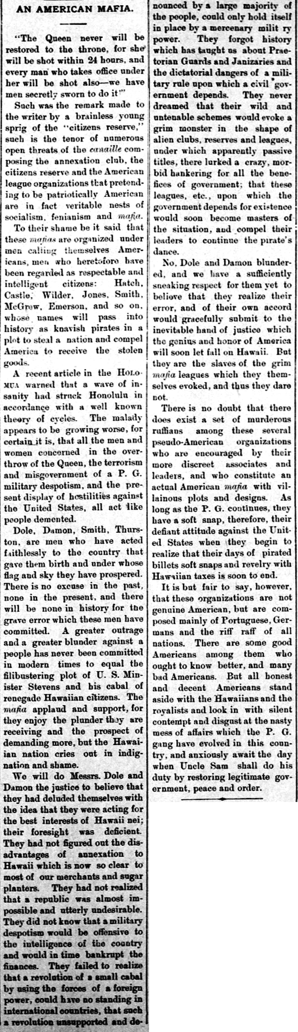 There is no doubt that there does exist a set of murderous ruffians among these several pseudo-American organizations who are encouraged by their more discreet associates and leaders, and who constitute an actual American mafia with villainous plots and designs. As long as the P. G. continues, they have a soft snap, therefore, their defiant attitude against the United States when they begin to realize that their days of pirated billets soft snaps and revelry with Hawaiian taxes is soon to end.
