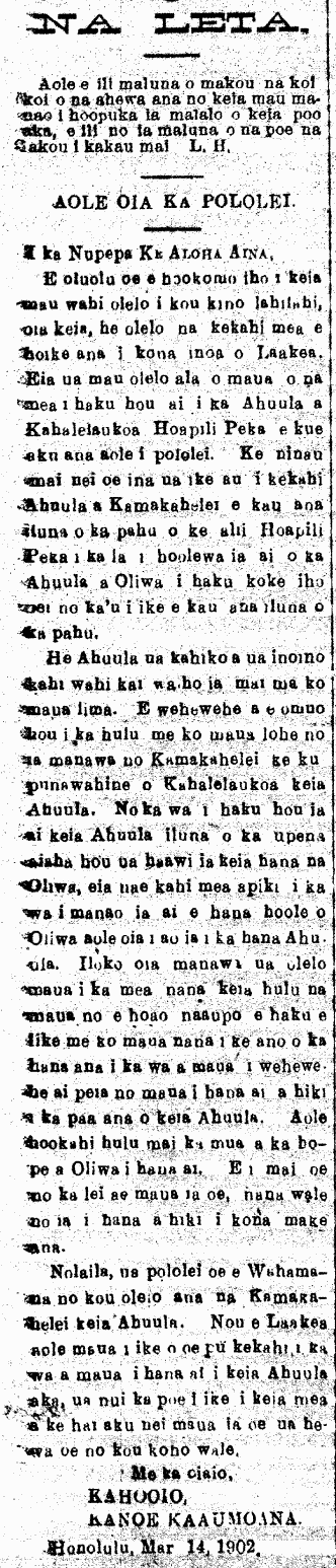 Please include these words in your delicate body, that being this, there is talk from someone calling himself Laakea. This is what we have to say, the two of us who redid the Ahuula of Kahalelaukoa Hoapili Baker [Kahalelaukoa Hoapili Peka], denying what he said is true. You asked if I had seen an Ahuula belonging to Kamakahelei upon the coffin of the alii Hoapili Baker on the day of his funeral, and if what I saw was the Ahuula that Oliwa quickly made on the coffin.