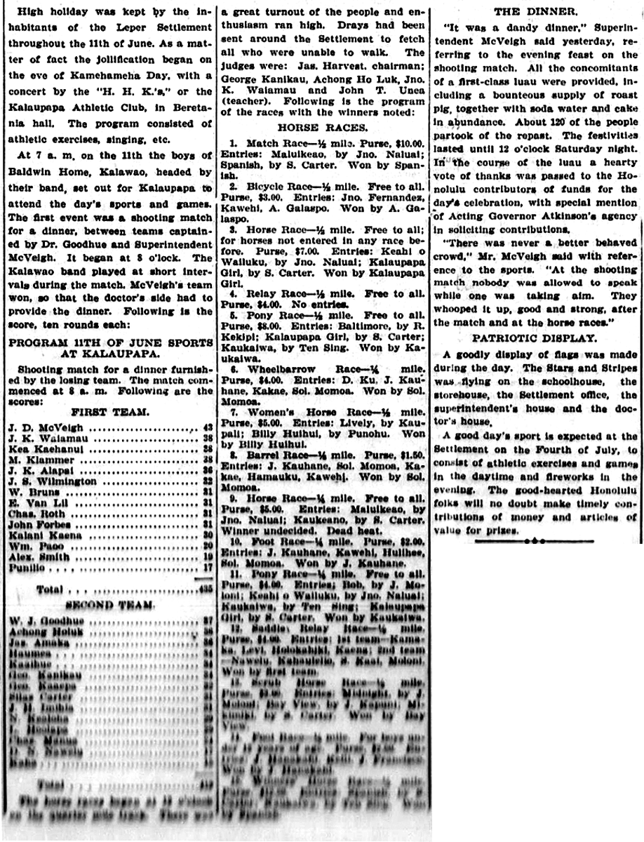 High holiday [Kamehameha Day] was kept by the inhabitants of the Leper Settlement throughout the 11th of June. As a matter of fact the jollification began on the eve of Kamehameha Day, with a concert by the “H. H. K.’s” [Hui Hooikaika Kino] or the Kalaupapa Athletic Club, in Beretania hall. The program consisted of athletic exercises, singing, etc.