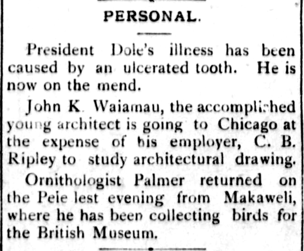 John K. Waiamau, the accomplished young architect is going to Chicago at the expense of his employer, C. B. Ripley to study architectural drawing.