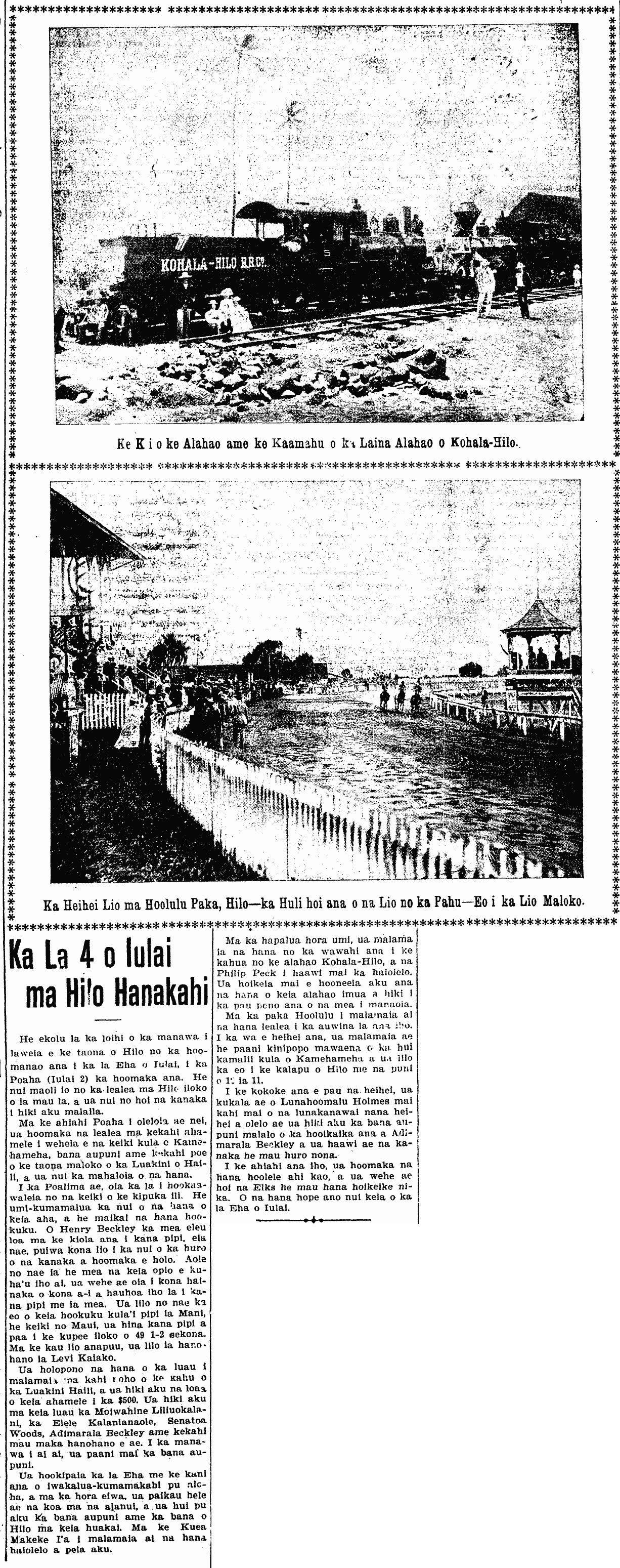 At Hoolulu Park was held the festivities of that afternoon. When the races were going on, a ballgame went on with the school boys of Kamehameha, and the victory went to the Hilo club with the score of 12 to 11.