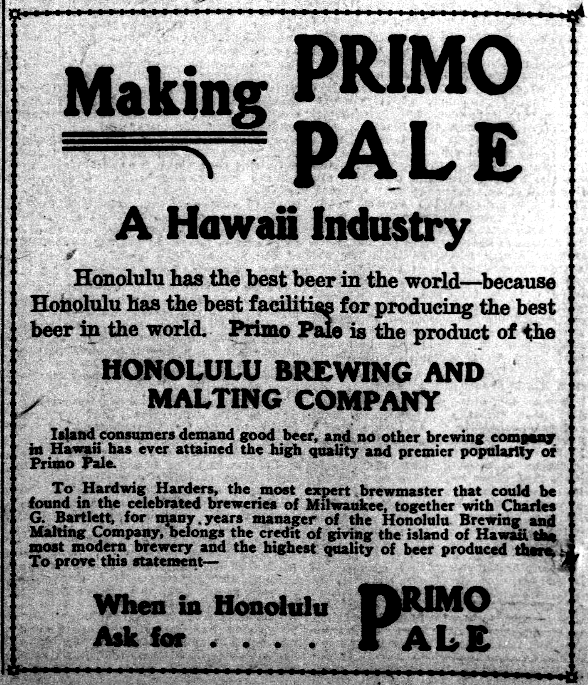 Honolulu has the best beer in the world—because Honolulu has the best facilities for producing the best beer in the world. Primo Pale is the product of the