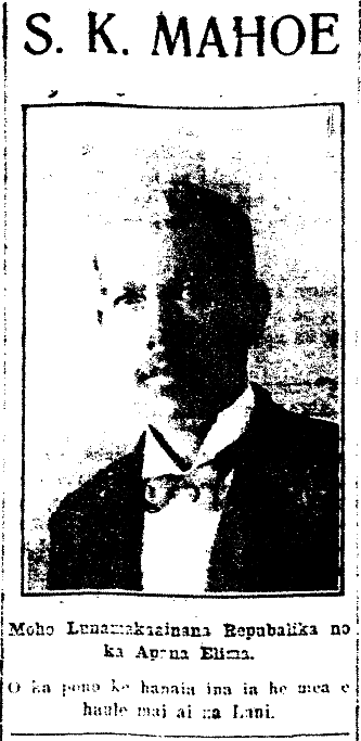 Samuel K. Mahoe for Representative, 1914. Posted on October 12, 2014 by nupepa 1 S. K. MAHOE Republican Representative Candidate for District Five. One must do what is right, even were it to cause the Heavens to fall. [O ka pono ke hanaia ina ia he mea e haule mai ai na Lani.] (Kuokoa, 10/9/1914, p. 3) Ka Nupepa Kuokoa, Buke LII, Helu 42, Aoao 3. Okatoba 9, 1914.
