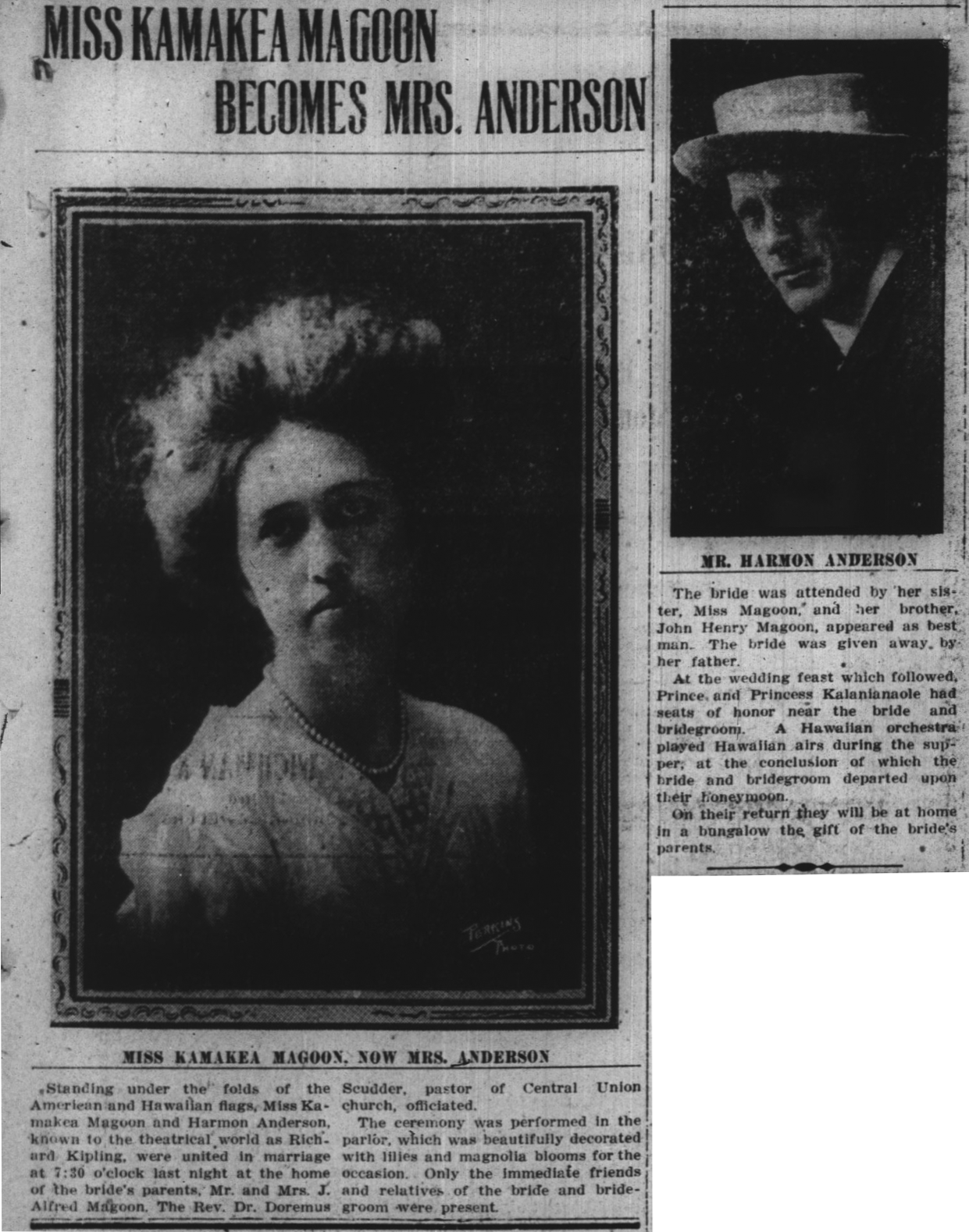 Standing under the folds of the American and Hawaiian flags, Miss Kamakea Magoon and Harmon Anderson, known to the theatrical world a Richard Kipling, were united in marriage at 7:30 oʻclock last night at the home of the bride’s parents, Mr. and Mrs. J. Alfred Magoon. The Rev. Dr. Doremus, pastor of Central Union church, officiated.