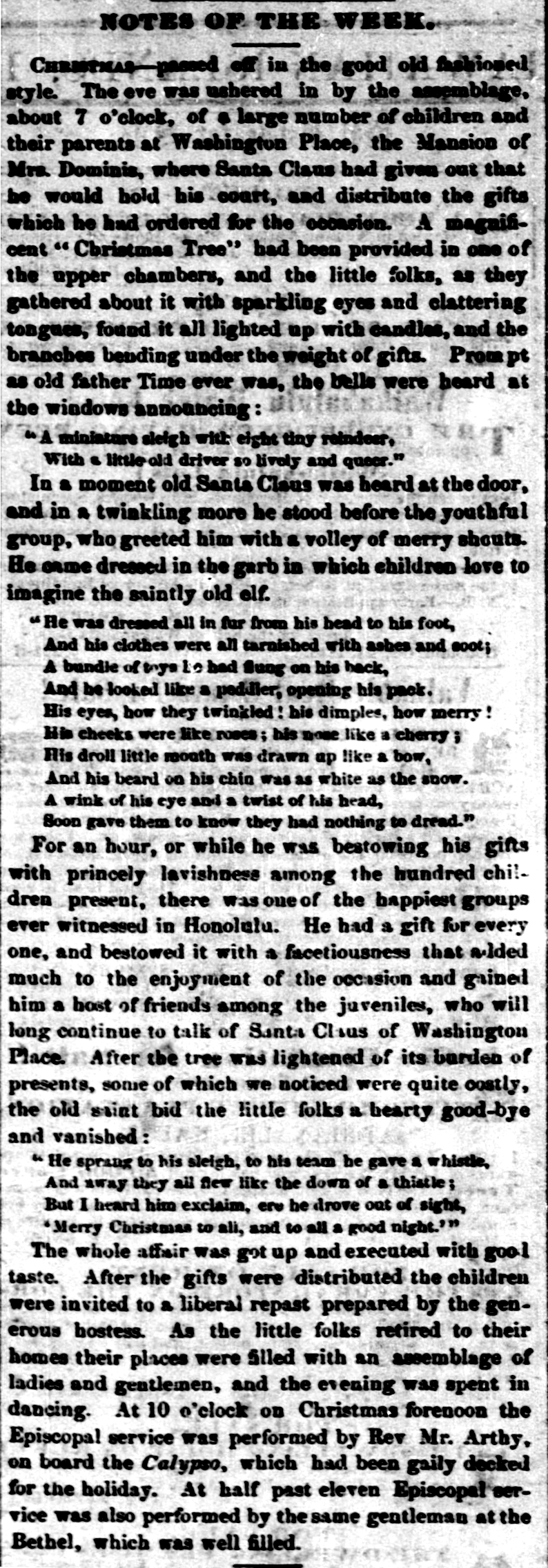 Christmas—passed off in the good old fashioned style. The eve was ushered in by the assemblage, about 7 o’clock, of a large number of children and their parents at Washington Place, the Mansion of Mrs. Dominis, where Santa Claus had given out that he would hold his court, and distribute the gifts which he had ordered for the occasion. A magnificent “Christmas Tree” had been provided in one of the upper chambers, and the little folks, as they gathered about it with sparkling eyes and clattering tongues, found it all lighted up with candles, and the branches bending under the weight of gifts. Prompt as old father Time ever was, the bells were heard at the windows announcing: