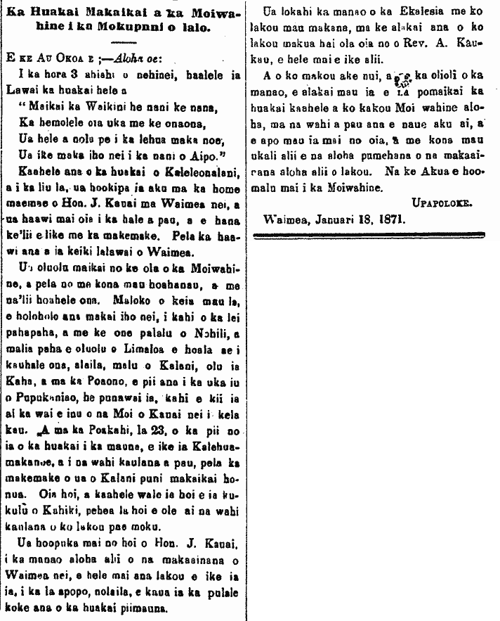The Queen is in splendid health, and so too of her cousins, and her fellow alii. These days, she travelled seaside, the place of the pahapaha seaweed lei, and the rumbling sands of Nohili, and perhaps Limaloa will be kind enough to build his village, then the Royal One will be shaded and that Stretch will be enjoyable; and on Saturday, they will climb the heights of Pupukaniao, a spring where the drinking water of the Kings of Kauai nei were fetched in those days. And on Monday, the 23rd, the group will climb the mountain to see Kalehuamakanoe and all of the famed places; that is the desire of the Royal One who enjoys travelling the world. Being that if lands afar [Kukulu o Kahiki] were toured by her, how could she not the famous places of their own islands.