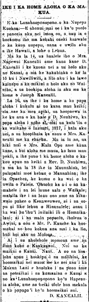 On the 14th, Mrs. Napewai [Naapuwai] Kanealii and her husband D. Kanealii left this town and went to Kauai, and in the morning of the 15th, we landed in Nawiliwili, were taken by the tossing of the machine to Wainiha and were lovingly welcomed in the home of Joseph Kanealii.
