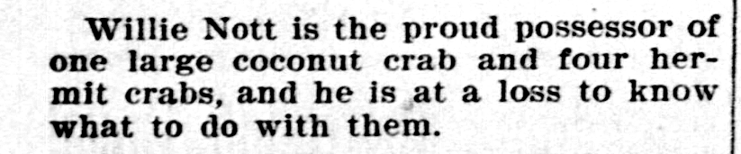 Coconut crab in Hawaii, 1897. Posted on December 23, 2014 by nupepa [Found under: “LOCAL BREVITIES”] Willie Nott is the proud possessor of one large coconut crab and four hermit crabs, and he is at a loss to know what to do with them. (Pacific Commercial Advertiser, 7/27/1897, p. 7) The Pacific Commercial Advertiser, Volume XXVI, Number 4670, Page 7. July 27, 1897. Share this: Click to share on X (Opens in new window) X Click to share on Facebook (Opens in new window) Facebook Click to email a link to a friend (Opens in new window) Email Click to print (Opens in new window) Print Like Loading... Related