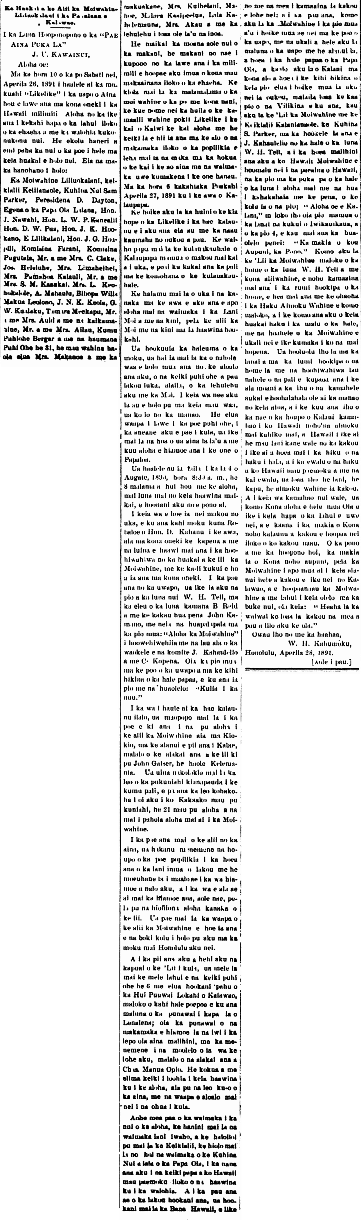 At 10 at night on this past Sunday, April 26, 1891, the steamship Likelike left the wharf of Ainahou, taking upon her deck beloved Hawaii’s favorite, to see the group of the lahui who are in pain and great suffering. There were three hundred or so people on this tour. Here are the dignitaries who went: