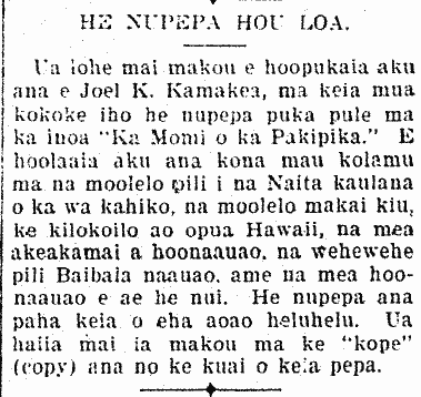 We have heard that Joel K. Kamakea will in the near future print a new weekly newspaper named “Ka Momi o ka Pakipika.” Its columns will be dedicated to stories about the famous Knights of the olden days, detective stories, Hawaiian cloud reading, scientific and educational material, knowledgeable things dealing with the Bible, and many other educational things. This will probably be a paper of four pages. We were told that it will be sold by the copy.