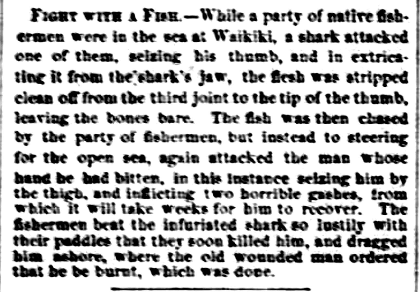 Fight with a Fish.—While a party of native fishermen were in the sea at Waikiki, a shark attacked one of them, seizing his thumb, and in extricating it from the shark’s jaw, the flesh was stripped clean off from the third joint to the tip of the thumb, leaving the bones bare. The fish was then chased by the party of fishermen, but instead to steering for the open sea, again attacked the man whose hand he had bitten, in this instance seizing him by the thigh, and inflicting two horrible gashes, from which it will take weeks for him to recover. The fishermen beat the infuriated shark so lustily with their paddles that they soon killed him, and dragged him ashore, where the old wonded man ordered that he be burnt, which was done.