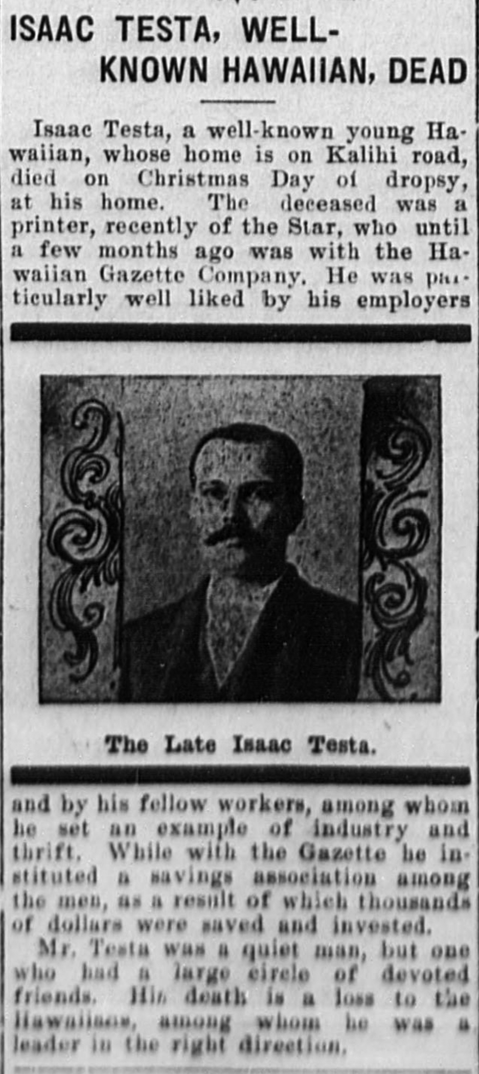 Isaac Testa, a well-known young Hawaiian, whose home is on Kalihi road, died on Christmas Day of dropsy, at his home. The deceased was a printer, recently of the Star, who until a few months ago was with the Hawaiian Gazette Company. He was particularly well liked by his employers…