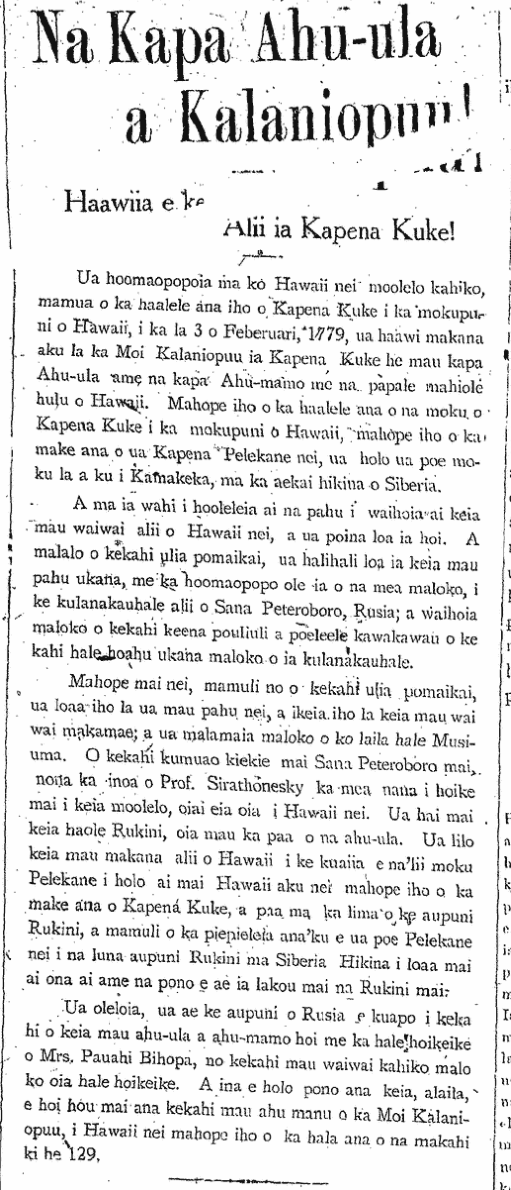 Since then, as a result of a lucky accident [another!], the boxes were found and these precious treasures were discovered; and it was cared for in a Museum there. A high-ranking teacher from Saint Petersburg named Prof. Sirathonesky [Sviatlovsky] was the one who revealed this history while he was here in Hawaii. This Russian haole said that the ahuula are still whole. These Hawaiian royal gifts were sold by the British ship officers who sailed from Hawaii after the death of Captain Cook, and were kept in the hands of the government of Russia; and as a result of the sale by those British men to the officials of Russia at Eastern Siberia, they received food and other goods from the Russians.