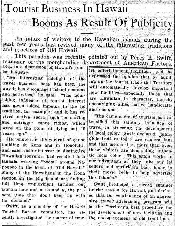 Swift, as a member of the Hawaii Tourist Bureau committee, has recently investigated the matter of tourist entertainment facilities; and he expressed the opinion that by building up the tourist trade the Territory will automatically develop important new facilities—especially those that are Hawaiian in character, thereby encouraging allied native handicrafts and customs.