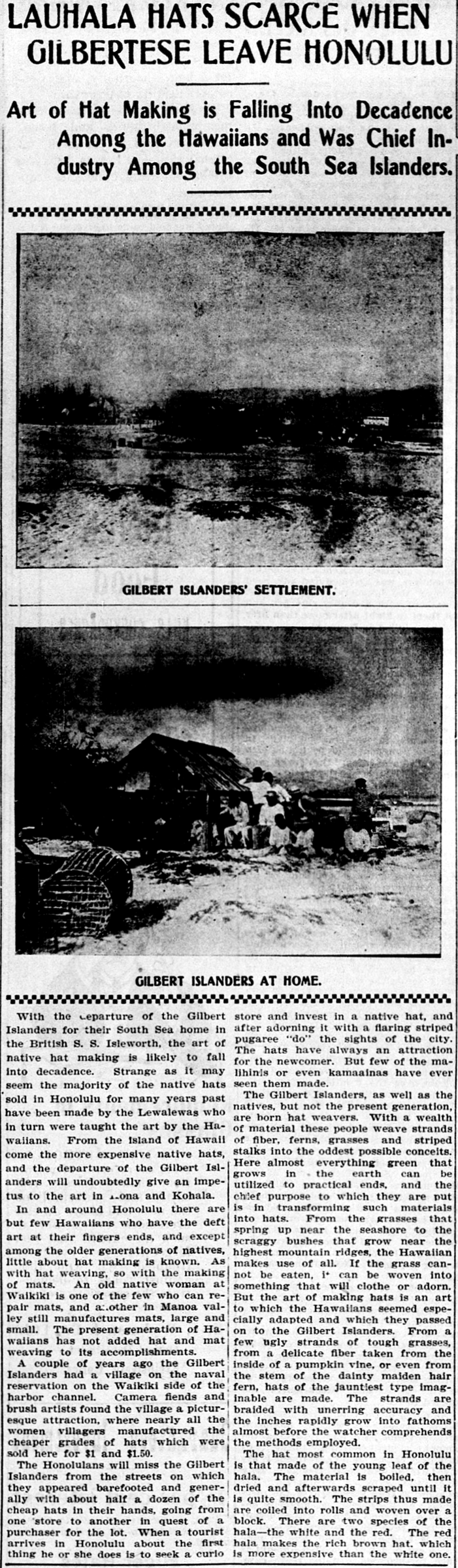 With the departure of the Gilbert Islanders for their South Sea home in the British S. S. Isleworth, the art of native hat making is likely to fall into decadence. Strange as it may seem the majority of the native hats sold in Honolulu for many years past have been made by the Lewalewas who in turn were taught the art by the Hawaiians. Form the Island of Hawaii come the more expensive native hats, and the departure of the Gilbert Islanders will undoubtedly give an impetus to the art in Kona and Kohala.