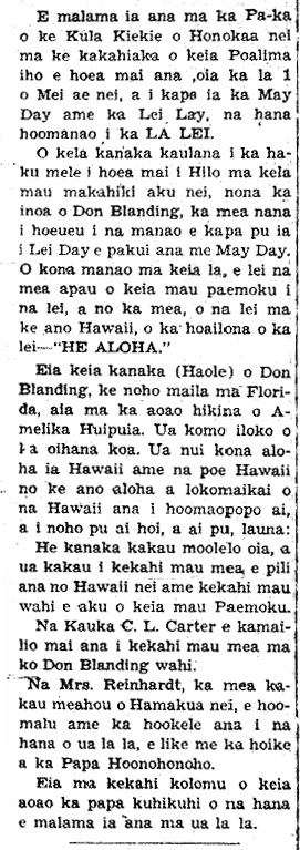 That man famous for his musical compositions who came to Hilo some years ago, named Don Blanding, is the one who pushed the idea of saying Lei Day along with May Day. His idea for this day was for everyone across the islands to wear a lei, for the reason that lei in Hawaii, lei symbolize—”ALOHA.”