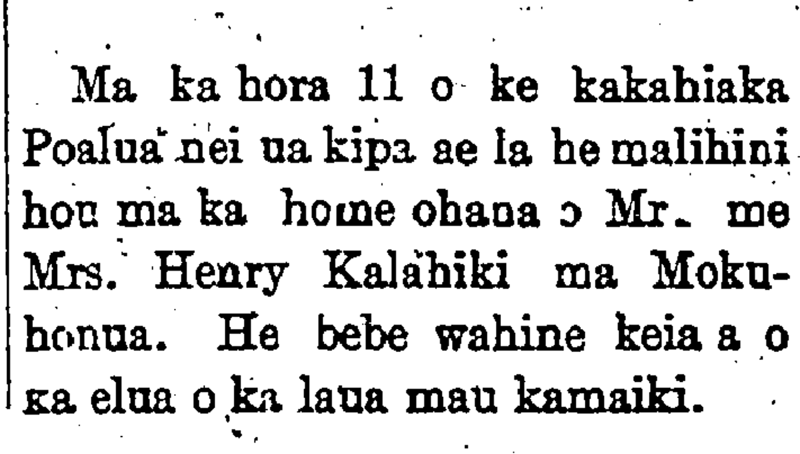 At 11 o’clock in the morning of this past Tuesday, the family home of Mr. and Mrs. Henry Kalahiki at Mokuhonua was visited by a new malihini. This is a baby girl, and the second of their children.