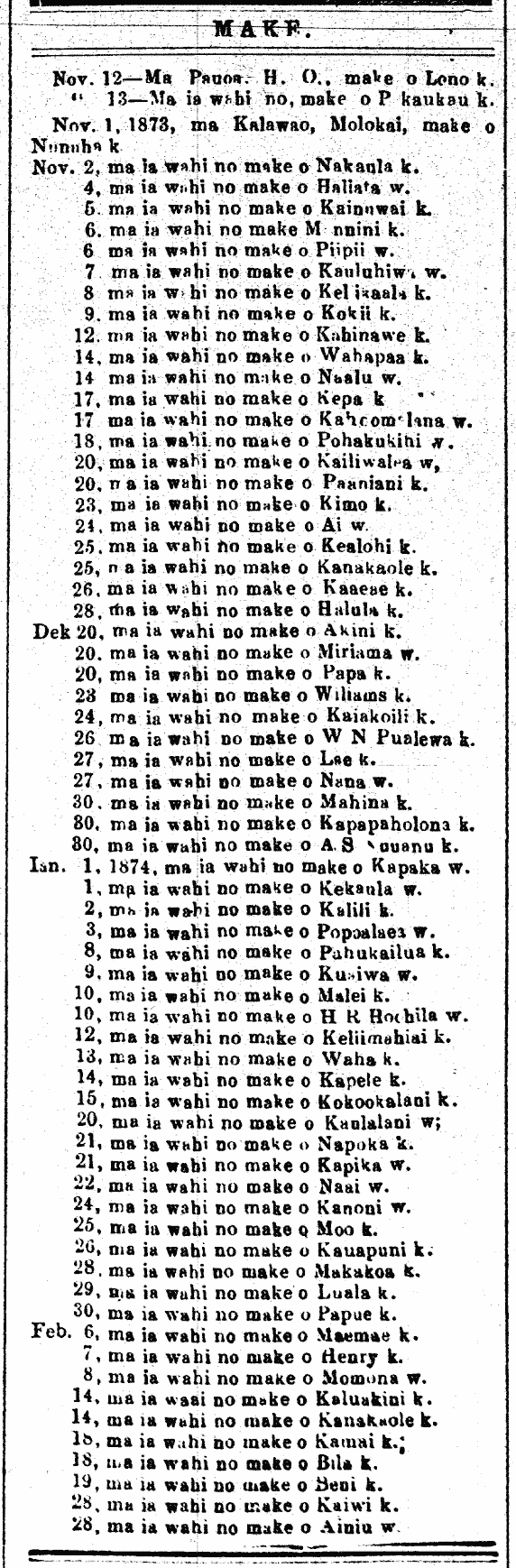 Jan. 1, 1874, at the same location, Kapaka (f) died.