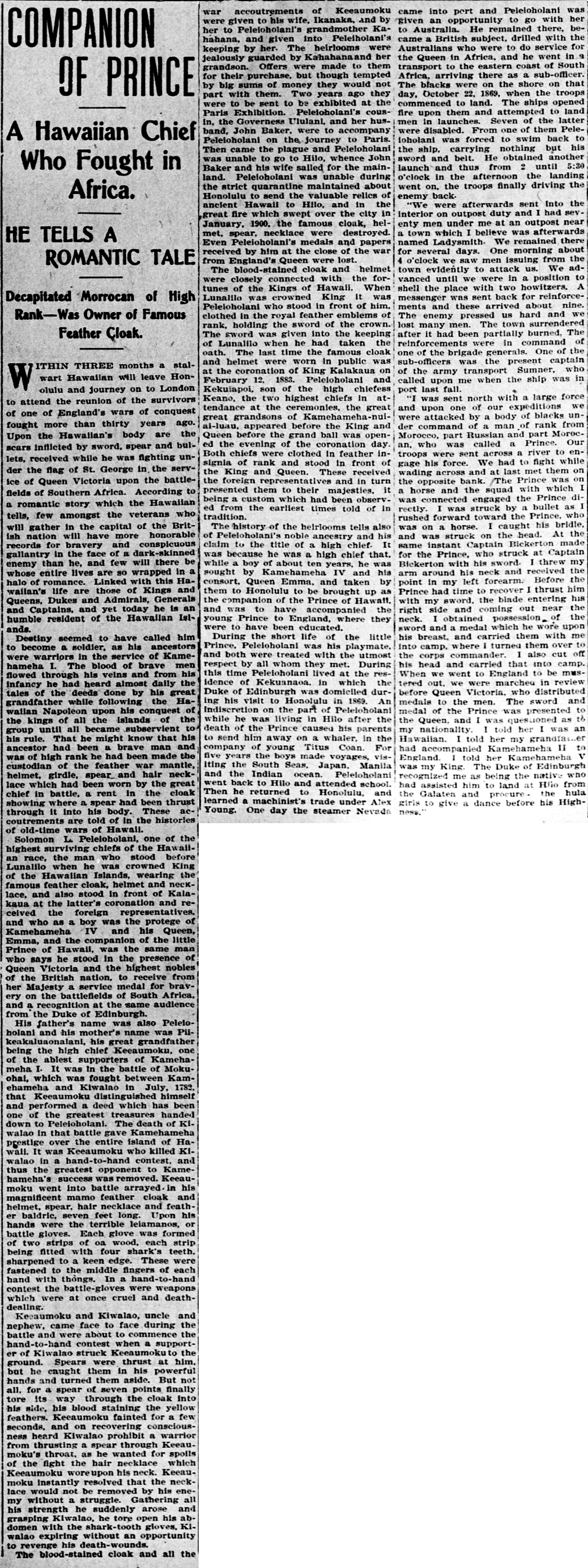 Solomon L. Peleioholani, one of the highest surviving chiefs of the Hawaiian race, the man who stood before Lunalilo when he was crowned King of the Hawaiian Islands, wearing the famous feather cloak, helmet and necklace, and also stood in front of Kalakaua at the latter’s coronation and received the foreign representatives, and who as a boy was the protege of Kamehameha IV and his Queen, Emma, and the companion of the little Prince of Hawaii, was the same man who says he stood in the presence of Queen Victoria and the highest nobles of the British nation, to receive from her Majesty a service medal for bravery on the battlefields of South Africa, and a recognition at the same audience from the Duke of Edinburgh.