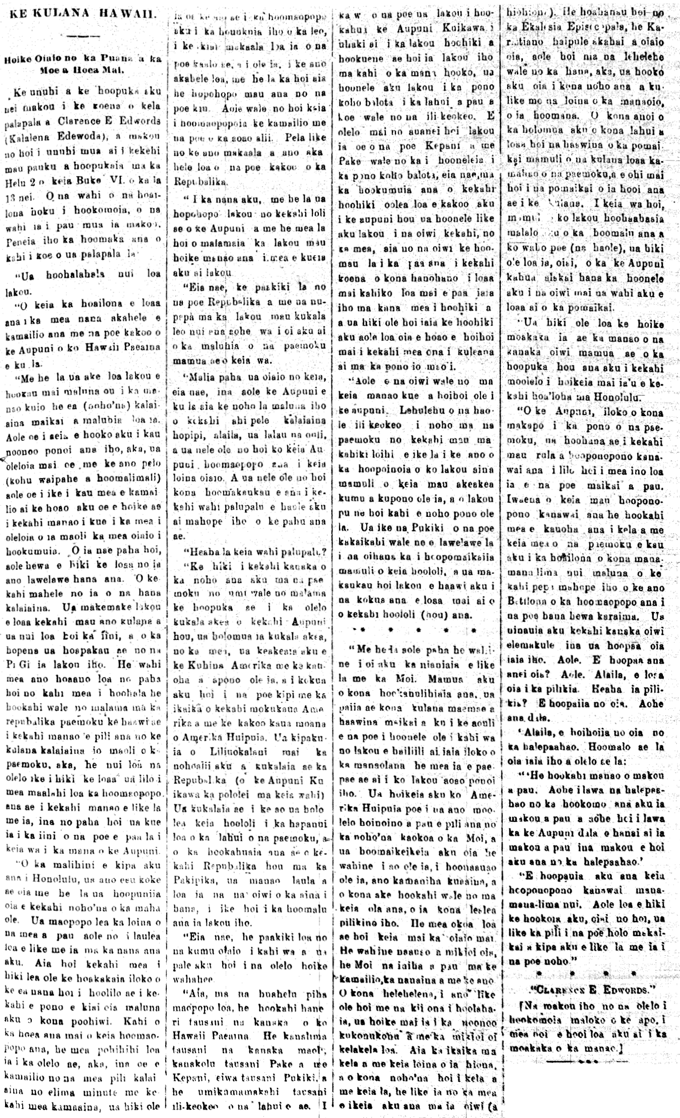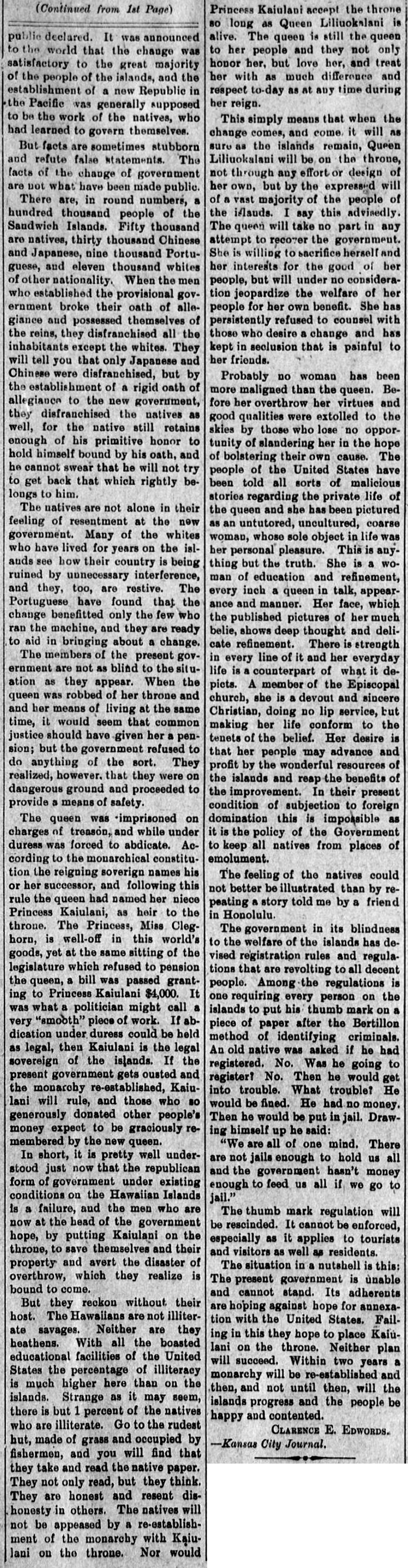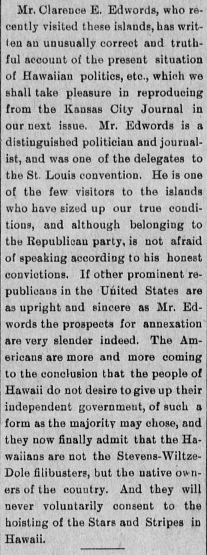 Mr. Clarence E. Edwords, who recently visited these islands, has written an unusually correct and truthful account of the present situation of Hawaiian politics, etc. which we shall take pleasure in reproducing from the Kansas City Journal in our next issue. Mr. Edwords is a distinguished politician and journalist, and was one of the delegates to the St. Louis convention. He is one of the few visitors to the islands who have sized up our true conditions, and although belonging to the Republican party, is not afraid of speaking according to his honest convictions. If other prominent republicans in the United States are as upright and sincere as Mr. Edwords the prospects for annexation are very slender indeed. The Americans are more and more coming to the conclusion that the people of Hawaii do not desire to give up their independent government, of such a form as the majority may chose, and they now finally admit that the Hawaiians are not the Stevens-Wiltze-Dole filibusters, but the native owners of the country. And they will never voluntarily consent to the hoisting of the Stars and Stripes in Hawaii.