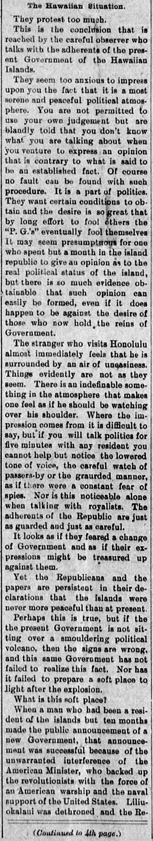 “The stranger who visits Honolulu almost immediately feels that he is surrounded by an air of uneasiness. Things evidently are not as they seem. There is an indefinable something in the atmosphere that makes one feel as if he should be watching over his shoulder. Where the impression comes from it is difficult to say, but if you will talk politics for five minutes with any resident you cannot help but notice the lowered tone of voice, the careful watch of passers-by or the graurded manner, as if there were a constant fear of spies. Nor is this noticeable alone when talking with royalists. The adherents of the Republic are just as guarded and just as careful.