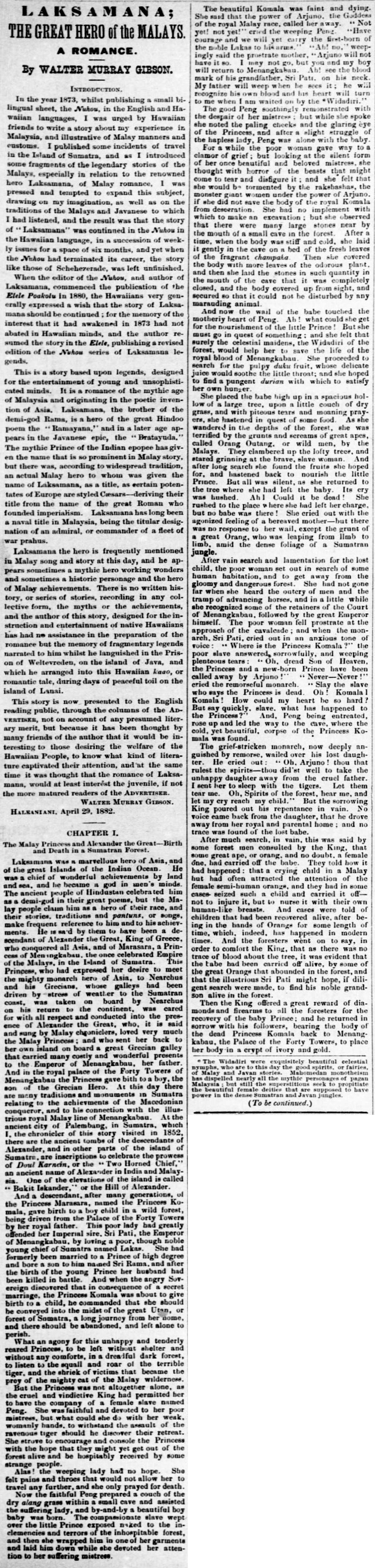 This story is now presented to the English reading public, through the columns of the Advertiser, not on account of any presumed literary merit, but because it has been thought by many friends of the author that it would be interesting to those desiring the welfare of the Hawaiian People, to know what kind of literature captivated their attention, and at the same time it was thought that the romance of Laksamana, would at least interest the juvenile, if not the more matured readers of the Advertiser.