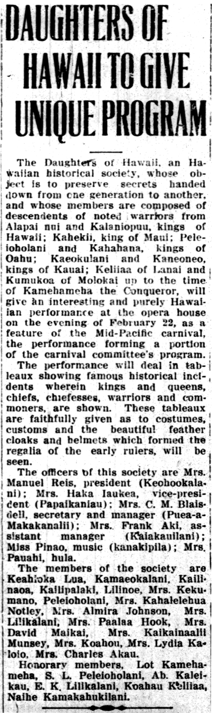 The Daughters of Hawaii, an Hawaiian historical society, whose object is to preserve secrets handed down from one generation to another, and whose members are composed of descendents of noted warriors from Alapai nui and Kalaniopuu, kings of Hawaii; Kahekili, king of Maui; Peleioholani and Kahahana, kings of Oahu; Kaeokulani and Kaneoneo, kings of Kauai; Keliiaa of Lanai and Kumukoa of Molokai up to the time of Kamehameha the Conqueror, will give an interesting and purely Hawaiian performance at the opera house on the evening of February 22, as a feature of the Mid-Pacific carnival, the performance forming a portion of the carnival committee’s program.