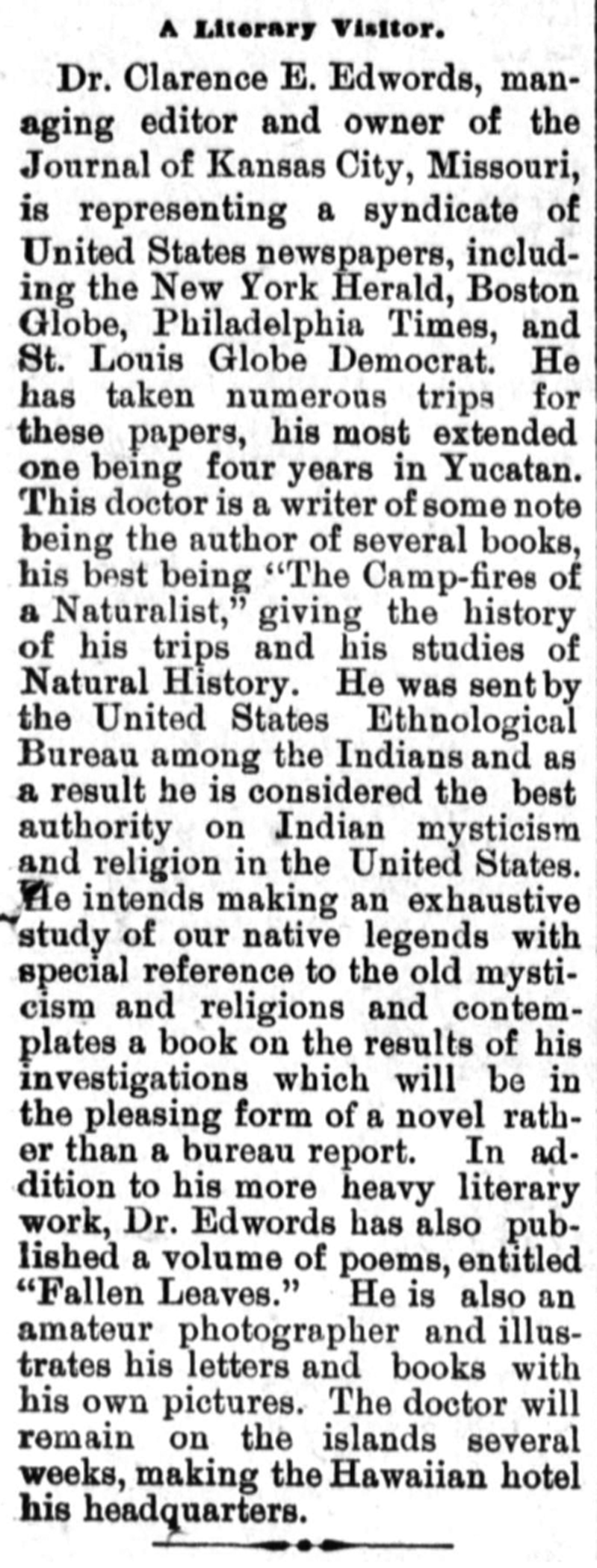 A person who subscribes himself “Clarence E. Edwords” and bounds into fame from the columns of the Kansas City Journal has settled the perplexing Hawaiian question to the satisfaction of everybody who is willing to accept his settlement. Mr. Edwords has the advantage over all dabblers in Hawaiian affairs in that he speaks “advisedly” and admits it, and, although he spent only one month on the island, it was sufficient for a man of Mr. Edwords’ masterful spirit. It might as well be said at once that Queen Liliuokalani is to be restored to the throne. There is no use beating about the bush or following false leads as to republics or annexation because they are pleasant. Mr. Edwords has been there and returned with the facts clinched, advisedly, and Mr. Edwords knows a thing or two, and both are to the same restorative effect.