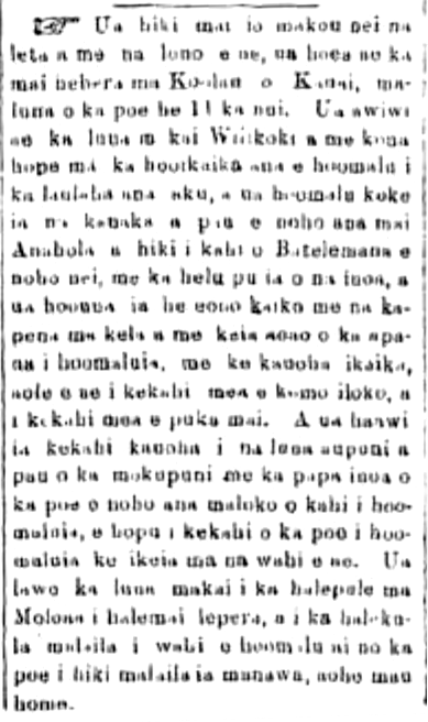 Letters and word arrived saying that smallpox appeared in Koolau on Kauai, upon people numbering 11. Sheriff Wilcox [luna makai Wilikoki] and his deputy acted quickly putting effort into quarantining against the spread, and immediately quarantined was all of the people living in Anahola all the way to where Bertlemann [Batelemana] lives, along with the listing of the names, and six policemen [kaiko] and captains were sent to the different sides of the quarantined area, with strict orders to not allow anyone to enter or any to exit. And an order was given to all heads of the government of the island with a list of the people living in quarantine, to arrest those quarantined if they are seen anywhere else. The district sheriff took the Moloaa church as a leprosy [lepera? smallpox, hepera?] hospital, and the school there as a place to quarantine for the people who arrive there at the time, not homes.