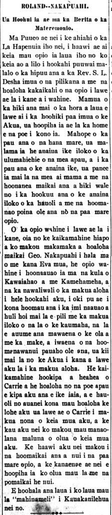 The young woman who took a husband was the eldest daughter of our intimate and good friend, George Nakapuahi who passed on and his first wife; she is a young woman educated at the schools of Kawaiahao and Kamehameha, and it was because of the debility of her beloved father who went on alone that she discontinued her education and returned to be with her father in the days of sadness, when he struggled between life and death, and while he was patient without despair; God fetched what was his and took her beloved father. Carrie is hospitable and a welcoming girl and is a friend to all who go and visit her, and her friends will be happy when they hear that Carrie has taken a father figure for the future, and we place our hopes upon you two from her forth. We give our congratulations a plenty to the young newlyweds, and pray that your days are filled with much blessings.
