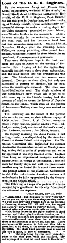 By the schooners Jenny and Waiola from Kauai on Saturday, we learn of the wreck, on Ocean Island, about 1,100 miles northwest of Honolulu, of the U. S. S. Saginaw, Capt. Sicard. She left this port in October last, and after touching at Midway Island,—(that unfortunately unsuccessful attempt to make a coaling depot for the China steamers)—proceeded to Ocean Island, some 70 miles further to the westward. There, by some mistake in the reckoning, she ran on the coral reef, and has become a total loss but few valuables being saved. On the 15th of November, 18 days after the wrecking, Lieut. Talbot,—a young promising officer,—and four seamen, volunteers, started for these islands, in an open boat, of course on short provisions.