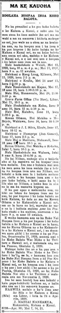Waioli Courthouse, Hanalei, Wednesday, May 12, 1920, 10–4 p. m. Thursday, May 13, 9–12 m.