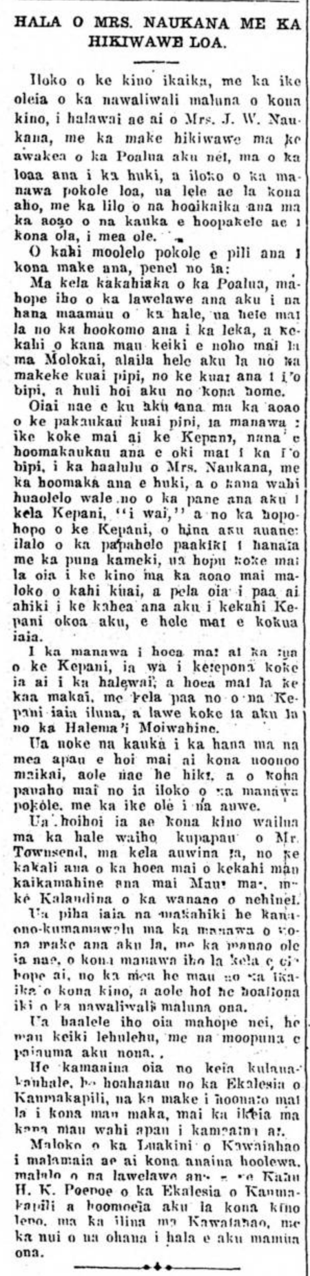 With strong body and without knowing of the weakness upon her body, Mrs. J. W. Naukana met with a quick death in midday on last Tuesday, because of a stroke, and in a very short time, her breath left her, and all the efforts on the part of the doctors to save her life were all for naught.