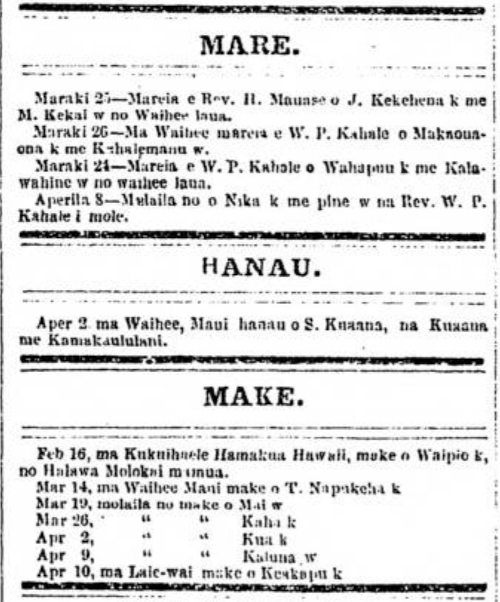 March 25—Married by Rev. H. Manase were J. Kekehena (m) and M. Kekai (f), the two are from Waihee.