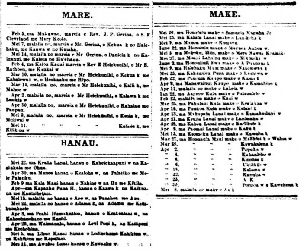 Apr. 30, at Honuaula, Maui, [?????] (f), Kawehena (m) died.