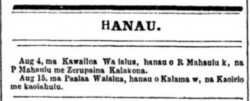 Aug. 4, at Kawailoa, Waialua, born was R. Mahaulu (m), to P. Mahaulu and Zerupaina Kalakona.