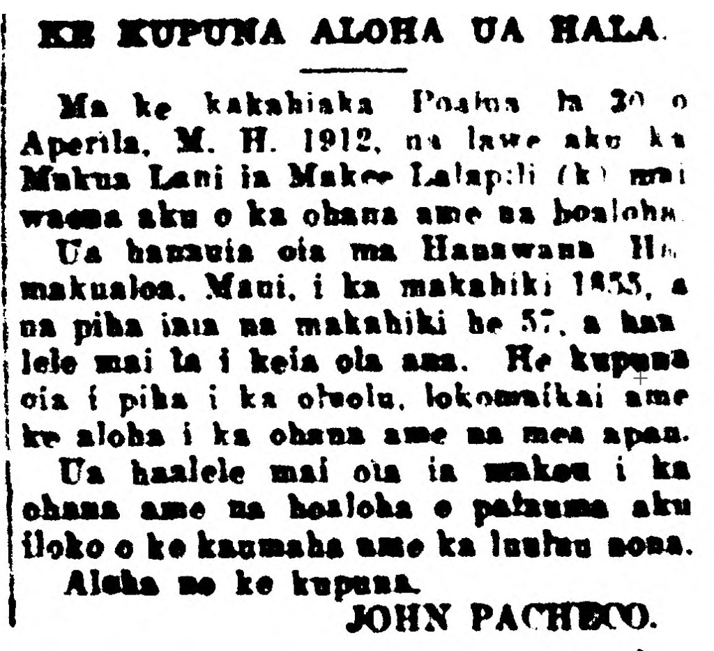 On the morning of Tuesday, the 30th of April, 1912, The Heavenly Father took Makee Lalapili (m) from amongst his family and friends.