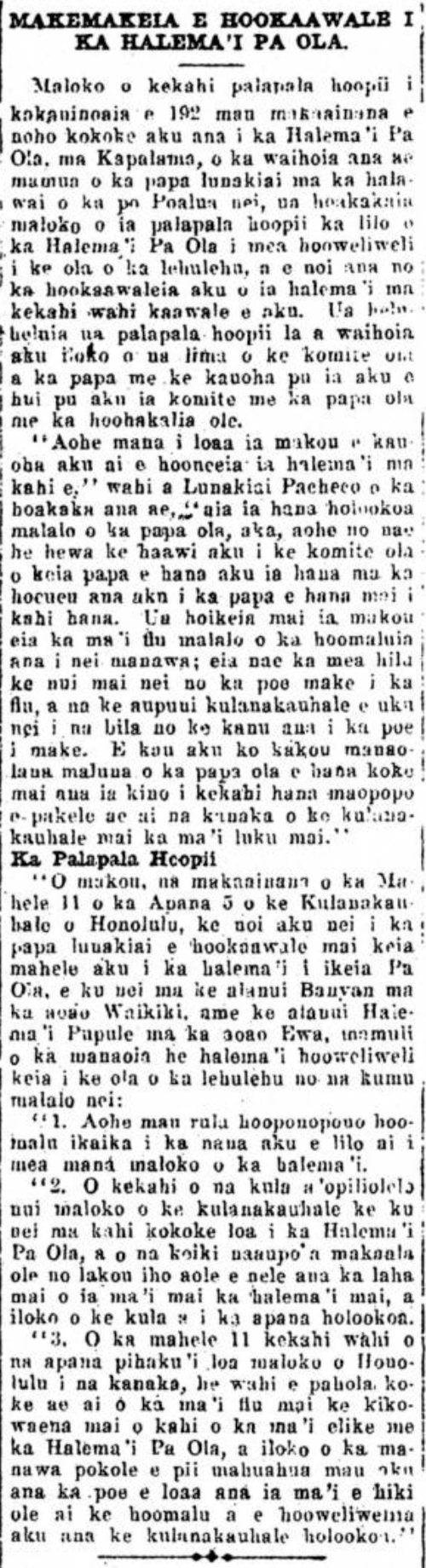 In a petition signed by 192 citizens residing near to the Pa Ola Hospital [Halema’i Pa Ola] in Kapalama, which was put before the board of supervisors [papa lunakiai] at the meeting this past Tuesday; made clear in the petition was that the Pa Ola Hospital had become something which threatens their lives, and they asked that the hospital be moved elsewhere. The petition was read and placed in the hands of the committee of that board, while asking that the committee meet with the board of health without delay.