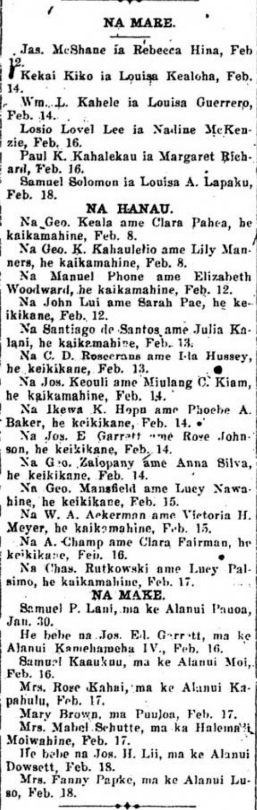 Kekai Kiko to Louisa Kealoha, Feb. 14.