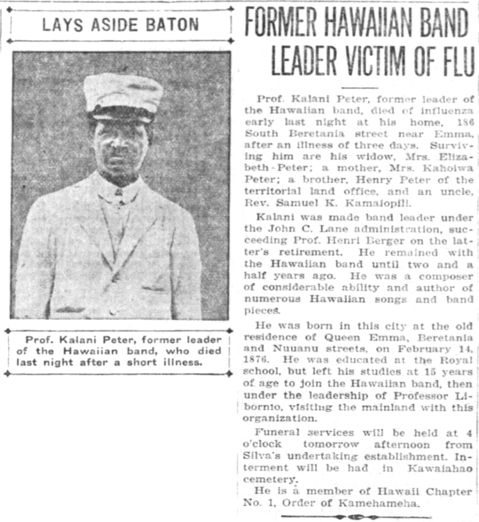 Prof. Kalani Peter, former leader of Hawaiian band, died of influenza early last night at his home, 186 South Beretania street near Emma, after an illness of three days. Surviving him are his widow, Mrs. Elizabeth Peter; a mother, Mrs. Kahoiwa Peter; a brother, Henry Peter of the territorial land office, and an uncle, Rev. Samuel K. Kamaiopili.