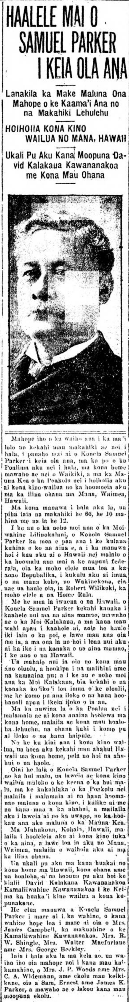 After suffering from a stroke some years ago, Colonel Samuel Parker grew weary of this life, on the night of last Friday, at his home outside of Waikiki, and his body was returned aboard the Mauna Kea of this past Wednesday to be laid to rest in his family cemetery at Mana, Waimea, Hawaii.