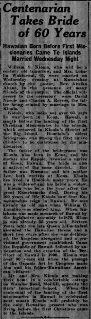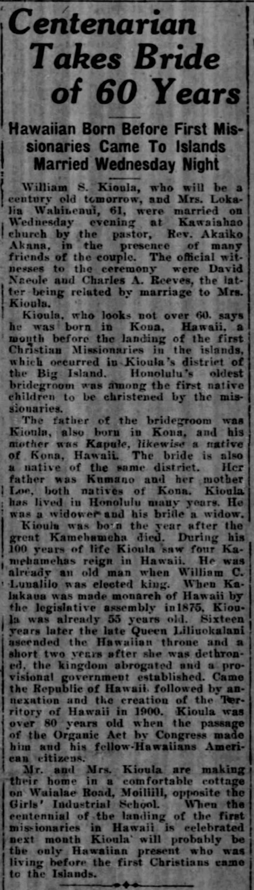 William S. Kioula, who will be a century old tomorrow, and Mrs. Lokalia Wahinenui, 61, were married on Wednesday evening, at Kawaiahao church by the pastor, Rev. Akaiko Akana, in the presence of many friends of the couple. The official witnesses to the ceremony were David Naeole and Charles A. Reeves, the latter being related by marriage to Mrs. Kioula.