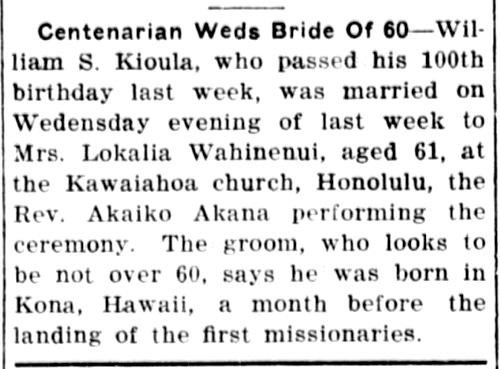 Centenarian Weds Bride of 60—William S. Kioula, who passed his 100th birthday last week, was married on Wednesday evening of last week to Mrs. Lokalia Wahinenui, aged 61, at the Kawaiahoa [Kawaiahao] church, Honolulu, the Rev. Akaiko Akana performing the ceremony. The groom, who looks to be not over 60, says he was born in Kona, Hawaii, a month before the landing of the first missionaries.